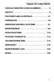 TABLE OF CONTENTS VEHICLE IDENTIFICATION NUMBERS . . . . . . . 5 SAFETY . . . . . . . . . . . . . . . . . . . . . . . . . . . . . . . . . . . 6 FEATURES AND CONTROLS . . . . . . . . . . . . . . . 31 OPERATION . . . . . . . . . . . . . . . . . . . . . . . . . . . . . . 43 EMISSION CONTROL SYSTEMS . . . . . . . . . . . . 61 MAINTENANCE . . . . . . . . . . . . . . . . . . . . . . . . . . . 62 SPECIFICATIONS . . . . . . . . . . . . . . . . . . . . . . . . 110 POLARIS PRODUCTS . . . . . . . . . . . . . . . . . .