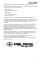 WELCOME Thank you for purchasing a Polaris vehicle, and welcome to our world-wide family of Polaris owners. We proudly produce an exciting line of utility and recreational products. S Snowmobiles S All-terrain vehicles (ATVs) S Quadricycles S RANGER utility vehicles S Victory motorcycles We believe Polaris sets a standard of excellence for all utility and recreational vehicles manufactured in the world today.