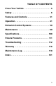 TABLE OF CONTENTS Know Your Vehicle . . . . . . . . . . . . . . . . . . . . . . . . . 5 Safety . . . . . . . . . . . . . . . . . . . . . . . . . . . . . . . . . . . . . 6 Features and Controls . . . . . . . . . . . . . . . . . . . . . 31 Operation . . . . . . . . . . . . . . . . . . . . . . . . . . . . . . . . . 41 Emission Control Systems . . . . . . . . . . . . . . . . . 59 Maintenance . . . . . . . . . . . . . . . . . . . . . . . . . . . . . . 60 Specifications . . . . . . . . . . . . . . . . . . . . . .