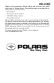 WELCOME Thank you for purchasing a Polaris vehicle, and welcome to our worldwide family of Polaris owners. We proudly produce an exciting line of utility and recreational products. • Snowmobiles • All-terrain vehicles (ATVs) • RANGER® utility vehicles • Victory Motorcycles® Always follow the instructions and recommendations in this manual.