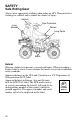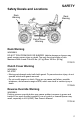 SAFETY Safety Decals and Locations General Warning WARNING Improper ATV use can result in SEVERE INJURY or DEATH ALWAYS USE AN APPROVED HELMET AND PROTECTIVE GEAR FOR OPERATOR AND PASSENGER NEVER USE ON PUBLIC ROADS NEVER CARRY MORE THAN ONE General PASSENGER Warning NEVER USE WITH DRUGS OR ALCOHOL NEVER operate: • without proper training or instruction • at speeds too fast for your skills, your passenger’s skills, or the conditions • on public roads - a collision can occur with another vehicle • with mor