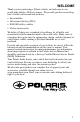 WELCOME Thank you for purchasing a Polaris vehicle, and welcome to our world-wide family of Polaris owners. We proudly produce an exciting line of utility and recreational products. S Snowmobiles S All-terrain vehicles (ATVs) S RANGER utility vehicles S Victory motorcycles We believe Polaris sets a standard of excellence for all utility and recreational vehicles manufactured in the world today.