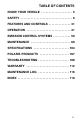 TABLE OF CONTENTS KNOW YOUR VEHICLE . . . . . . . . . . . . . . . . . . . . . 5 SAFETY . . . . . . . . . . . . . . . . . . . . . . . . . . . . . . . . . . . 6 FEATURES AND CONTROLS . . . . . . . . . . . . . . . 31 OPERATION . . . . . . . . . . . . . . . . . . . . . . . . . . . . . . 41 EMISSION CONTROL SYSTEMS . . . . . . . . . . . . 59 MAINTENANCE . . . . . . . . . . . . . . . . . . . . . . . . . . . 60 SPECIFICATIONS . . . . . . . . . . . . . . . . . . . . . . . . 104 POLARIS PRODUCTS . . . . . . . . . .