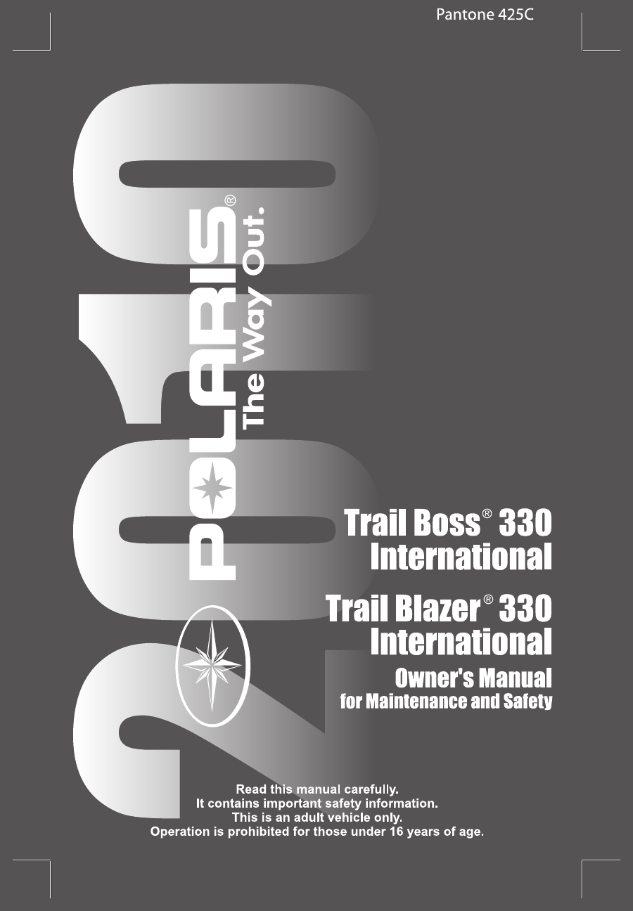 POLARIS, THE WAY OUT, TRAIL BOSS and TRAIL BLAZER are registered trademarks of Polaris Industries Inc. Copyright 2009 Polaris Sales Inc. All information contained within this publication is based on the latest product information at the time of publication. Due to constant improvements in the design and quality of production components, some minor discrepancies may result between the actual vehicle and the information presented in this publication.