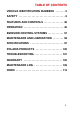 TABLE OF CONTENTS VEHICLE IDENTIFICATION NUMBERS . . . . . . . 5 SAFETY . . . . . . . . . . . . . . . . . . . . . . . . . . . . . . . . . . . 6 FEATURES AND CONTROLS . . . . . . . . . . . . . . . 30 OPERATION . . . . . . . . . . . . . . . . . . . . . . . . . . . . . . 40 EMISSION CONTROL SYSTEMS . . . . . . . . . . . . 57 MAINTENANCE AND LUBRICATION . . . . . . . . 58 SPECIFICATIONS . . . . . . . . . . . . . . . . . . . . . . . . . 97 POLARIS PRODUCTS . . . . . . . . . . . . . . . . . . . .