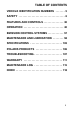 TABLE OF CONTENTS VEHICLE IDENTIFICATION NUMBERS . . . . . . . 5 SAFETY . . . . . . . . . . . . . . . . . . . . . . . . . . . . . . . . . . . 6 FEATURES AND CONTROLS . . . . . . . . . . . . . . . 30 OPERATION . . . . . . . . . . . . . . . . . . . . . . . . . . . . . . 40 EMISSION CONTROL SYSTEMS . . . . . . . . . . . . 57 MAINTENANCE AND LUBRICATION . . . . . . . . 58 SPECIFICATIONS . . . . . . . . . . . . . . . . . . . . . . . . 103 POLARIS PRODUCTS . . . . . . . . . . . . . . . . . . . .