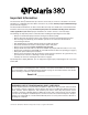 I. Introduction If you are unable to find genuine Polaris parts in your area, contact us at 1-800-VAC-SWEEP (USA and Canada only) to receive the name of the participating Polaris dealer nearest you. Congratulations on the purchase of your new automatic pool cleaner, and thank you for choosing a Polaris Vac-Sweep 380. The Polaris 380 is designed to give you years of dependable and efficient service. With the Polaris 380, you and your family can spend more time enjoying your pool and less time cleaning it.