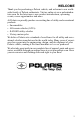 WELCOME Dear Parents: We believe your children should have the opportunity to enjoy The Way Out experience along with you. We've provided this owner's manual to assist you and your children in learning about the safe operation and care of your new Polaris snowmobile. Please review the information in this manual with any child who may operate the snowmobile. Help your children learn to operate the snowmobile with safety as a top priority.