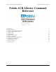 Pololu AVR Library Command Reference © 2001–2009 Pololu Corporation 1. Introduction This document describes a programming library designed for use with Pololu products. The library is used to create programs that run on Atmel ATmega168 and ATmega48 processors, and it supports the following products: Pololu 3pi robot: a mega168-based robot controller. The 3pi robot essentially contains an LV-168 and a 5-sensor version of the QTR-8RC, both of which are in the list below.