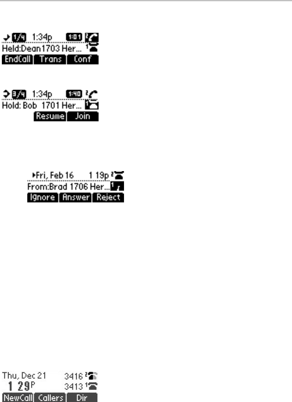 For example, the first figure shows Line 2 in a held call with Dean at extension 1703 and Line 1 has a call