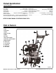Product Specifications • Save all instructions Unit Weight . . . . . . . . . . . . . . . . . . . . . . . . . . . . . . 110 lb (50kg) Tilling Width . . . . . . . . . . . . . . . . . . . . . . . . up to 21in (533mm) Tilling Depths . . . . . . . . . . . . . . . . . . . . . . . . . . . . . . . . . up to 8” Tine Diameter . . . . . . . . . . . . . . . . . . . . . . . . . . . 11 in (279mm) Gasoline Type . . . . . . . . . . Regular Unleaded/88 Octane (min.) Gasoline Capacity . . . . . . . . . . . . . . . . . . .