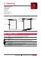 1. Unboxing 1 Open your package • Prestigio MultiPad • Travel charger • Carrying case • USB cable • OTG cable • Quick start guide • Legal and safety notices • Warranty card Your tablet at a glance Microphone Rear camera Power button Front camera Headset jack Memory card and SIM card slot Volume button Touch screen Speaker Micro USB port Buttons Button Definition Function Power • Press and hold to power on or off your tablet. • Press to lock or unlock the screen display.