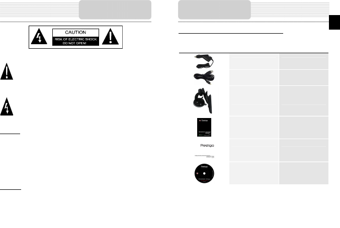 Important Safety Instructions Accessories EN Prestigio GeoVision 5850HDDVR–Accessories List ITEM NAME QTY Car Charger 1 USB Cable 1 Car Mount 1 User Manual 1 Warranty Card 1 Driver/Document CD 1 The exclamation point within an equilateral triangle is intended to alert the user to the presence of important operating and maintenance (servicing) instructions in the literature accompanying the appliance.