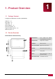 Contents 1. Product Overview 1.1 Package Contents 1.2 Device Overview 2. Getting Started 2.1 Charging the battery 2.2 Using the storage card 2.3 Hot plug of storage card 2.4 Memory space 2.5 Power on/off and Device Reset 2.6 Startup Wizard 3. Home Screen 3.1 Status and notifications 3.2 Shortcuts to Add widgets 3.3 Finger gestures 3.4 Coping files to and from the storage card 3.5 Searching the device and the web 4. Personalizing 4.1 Change the Notification ringtone 4.2 Change your wallpaper 4.