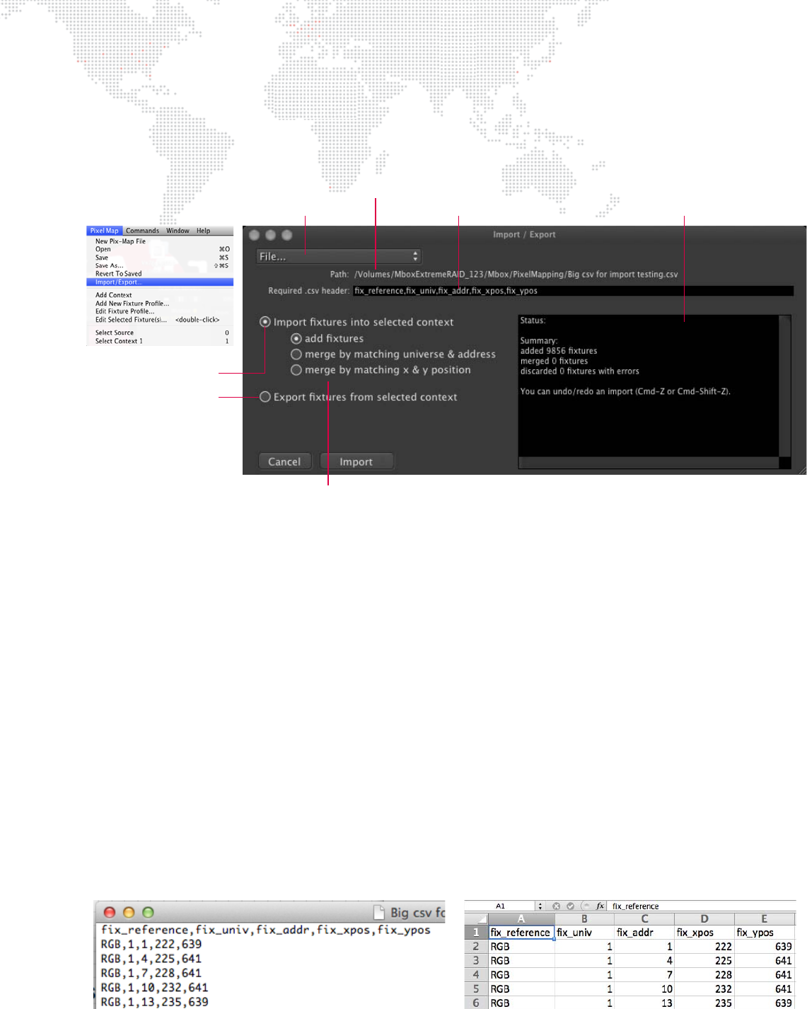 Pixel mapping data can also be imported and exported in comma separated values (.csv) format. This functionality