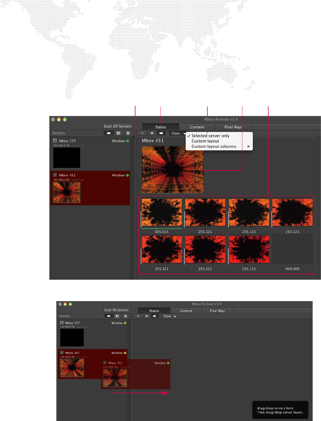 The Status tab of the Remote window shows, by default, the server’s master output and individual layer streams.