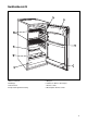 Geräteübersicht 4 1 5 2 6 8 3 7 1 Butter-/ Käsefach 2 Türablage 3 Flaschenfach 4 Temperaturregler/Beleuchtung 5 Ablagen 6 Tauwasser-Abfluss mit Reiniger 7 Gemüseschale 8 Abdeckplatte Gemüseschale 9