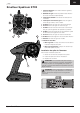 FR Emetteur Spektrum STX2 1. Volant de direction Commande la direction (gauche/ droite) du modèle 2. Gâchette des gaz Contrôle la puissance et la direction du moteur (marche avant/frein/arrière) 8 7 3. Interrupteur ON/OFF Commande l’alimentation de l’émetteur 6 4. Interrupteur de limite des gaz Permet de régler la limite des gaz à 50%, 75% et 100% 9 5. TH Rate Permet de régler la fin de course des gaz 6. TH Trim Permet de régler le neutre des gaz 7.