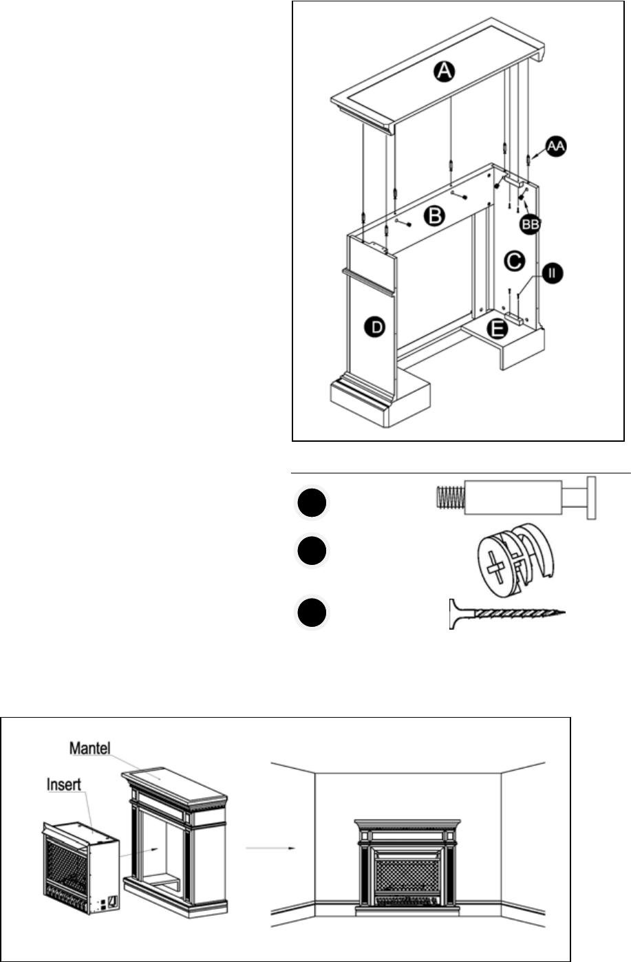3. Insert Cam Locks (BB) into assembled frame (B, C,