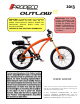 2013 IMPORTANT: ALUMINUM FRAME. NOT INTENDED FOR HARD RIDING. DO NOT JUMP OR HIT CURBS, AVOID IMPACTS. INSPECT FRAME FOR FRACTURES. SERIOUS BODILY HARM CAN OCCUR IF MISUSED. SEE MANUAL FOR ADDITIONAL INFORMATION. IMPORTANT: NOT PATH LEGAL. FEDERAL LAW MANDATES A MAXIMUM SPEED OF 20MPH FOR EBIKES TO BE BIKE PATH LEGAL. THE OUTLAW SS TRAVELS AT SPEEDS UP TO 28MPH. USER GUIDE Some of the content of this manual may differ from your bicycle depending on the options of the bicycle and what your dealer provided.