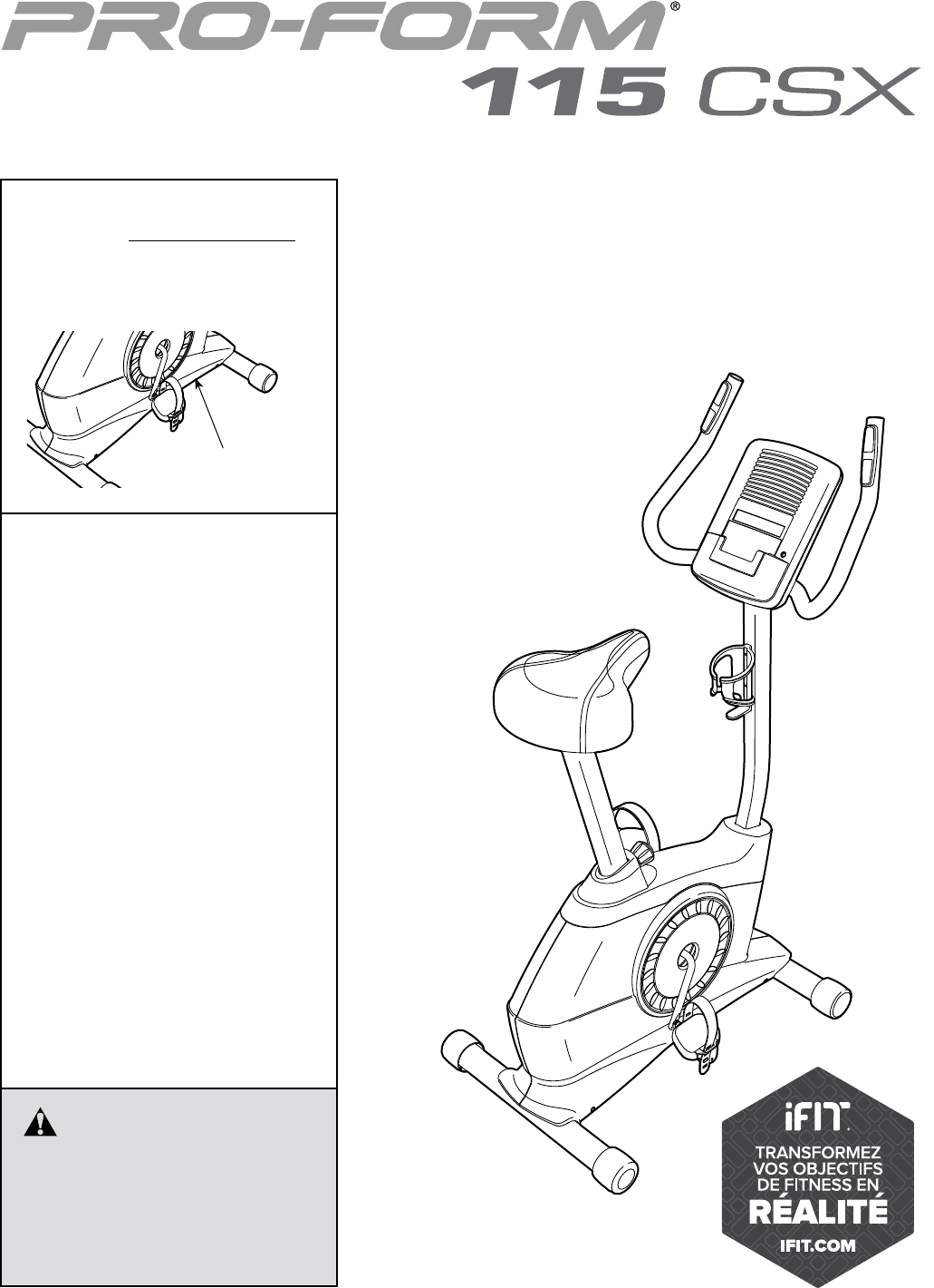 AVANT DE COMMENCER Merci d’avoir choisi le nouveau vélo d’exercice PROFORM® 115 CSX. Le vélo est un des exercices des plus efficaces pour améliorer la condition cardiovasculaire, développer l’endurance et raffermir tout le corps. Le vélo d'exercice 115 CSX offre un éventail impressionnant de fonctionnalités conçues pour rendre vos entraînements chez vous plus agréables et efficaces. avez des questions après avoir lu ce manuel, veuillez vous référer à la page de couverture de ce manuel pour nous contacter.
