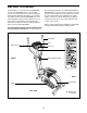 IMPORTANT PRECAUTIONS WARNING: To reduce the risk of serious injury, read the following important precautions before using the elliptical exerciser. 1. Read all instructions in this manual and all warnings on the elliptical exerciser before using the elliptical exerciser. 8. Wear appropriate athletic clothes and athletic shoes while using the elliptical exerciser. 9. Always hold the handles on the console or the handlebars while mounting, dismounting, or using the elliptical exerciser. 2.