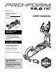 www.proform.com Model No. PFEL09812.1 Serial No. Write the serial number in the space above for reference. Serial Number Decal ACTIVATE YOUR WARRANTY To register your product and activate your warranty today, go to www.proformservice.com/ registration. CUSTOMER CARE For service at any time, go to www.proformservice.com. Or call 1-888-533-1333 Mon.–Fri. 6 a.m.–6 p.m. MT Sat. 8 a.m.–12 p.m. MT Please do not contact the store.