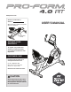 www.proform.com Model No. PFEX13813.0 Serial No. Write the serial number in the space above for reference. Serial Number Decal ACTIVATE YOUR WARRANTY To register your product and activate your warranty today, go to www.proformservice.com/ registration. CUSTOMER CARE For service at any time, go to www.proformservice.com. Or call 1-888-533-1333 Mon.–Fri. 6 a.m.–6 p.m. MT Sat. 8 a.m.–12 p.m. MT Please do not contact the store.