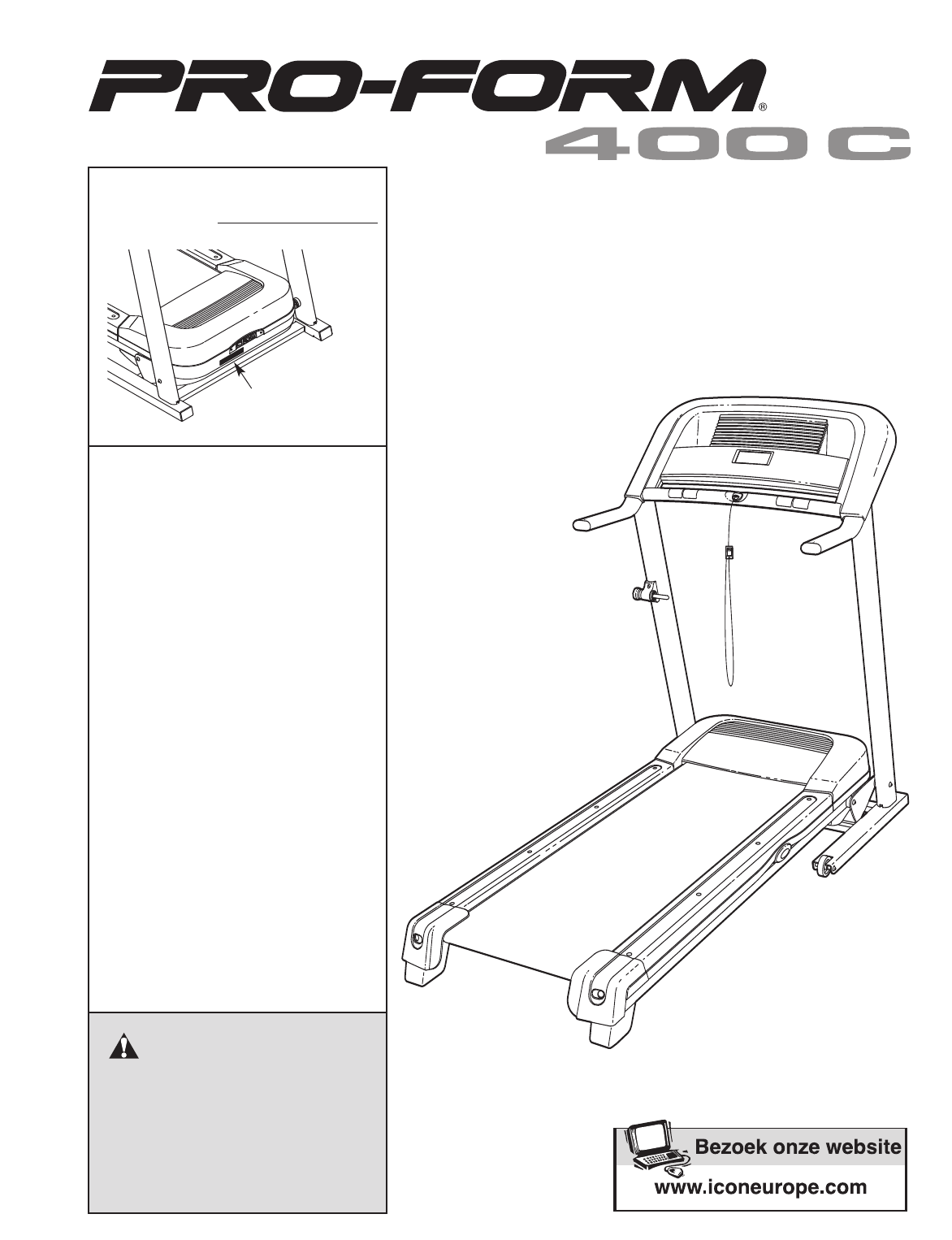 VOORDAT U BEGINT Fijn dat u voor de nieuwe PROFORM® 400 C loopband gekozen heeft. De 400 C loopband combineert geavanceerde technologie met een innovatief ontwerp zodat u bij u thuis uw lichamelijke conditie kunt opbouwen en verbeteren. En wanneer u de loopband niet gebruikt kunt u de 400 C loopband inklappen zodat hij minder ruimte in beslag neemt dan andere loopbanden. mocht u nog vragen hebben contact op met de winkel waar u de loopband heeft gekocht.