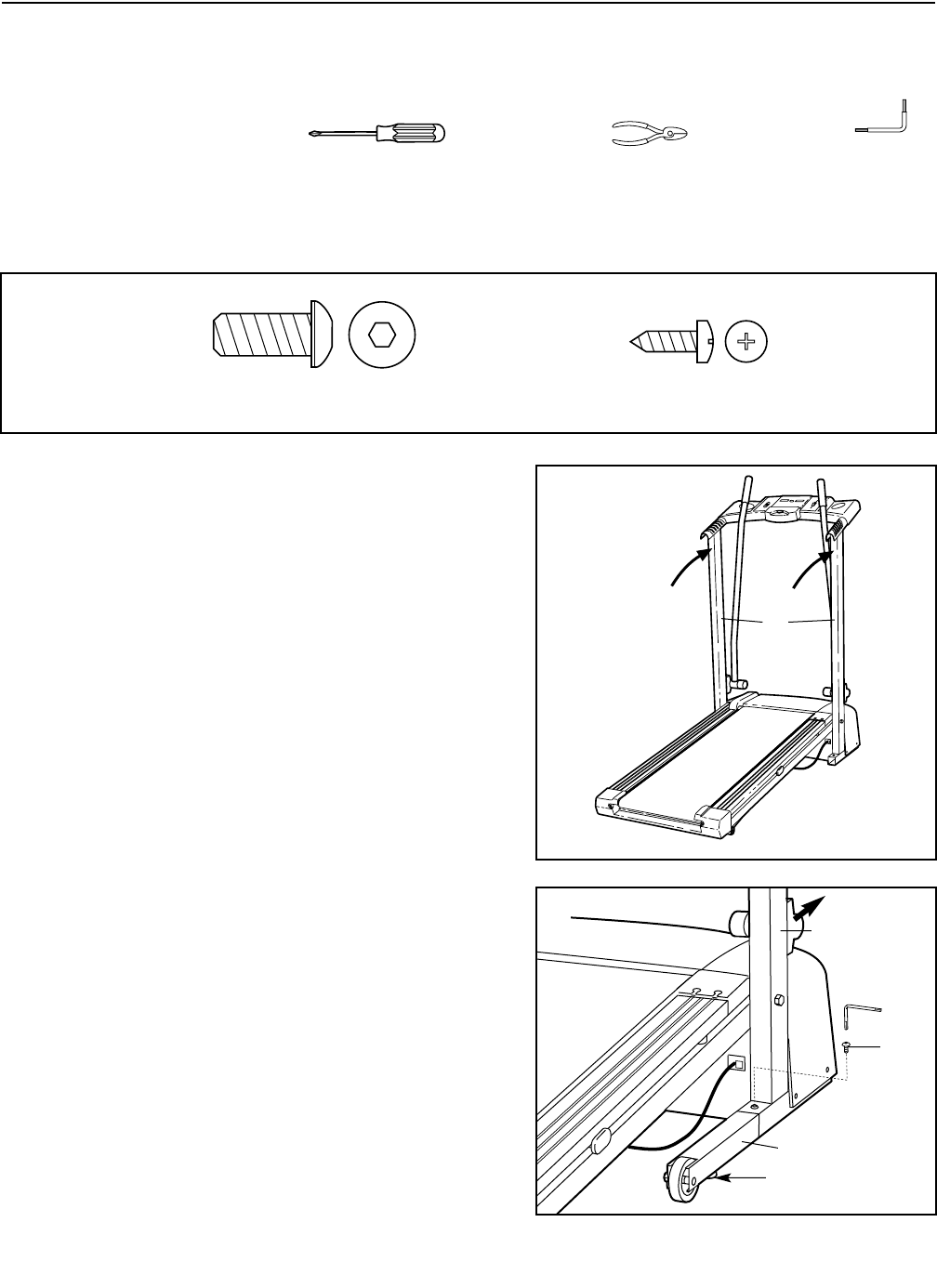 Assembly requires two people. Set the treadmill in a cleared area and remove all packing materials. Do not