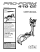 BEFORE YOU BEGIN Thank you for selecting the revolutionary PROFORM® 410 CE elliptical. The 410 CE elliptical provides an impressive selection of features designed to make your workouts at home more effective and enjoyable. manual. To help us assist you, note the product model number and serial number before contacting us. The model number and the location of the serial number decal are shown on the front cover of this manual. For your benefit, read this manual carefully before you use the elliptical.