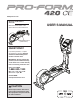 BEFORE YOU BEGIN Thank you for selecting the revolutionary PROFORM® 420 CE elliptical. The 420 CE elliptical provides an impressive selection of features designed to make your workouts at home more effective and enjoyable. manual. To help us assist you, note the product model number and serial number before contacting us. The model number and the location of the serial number decal are shown on the front cover of this manual. For your benefit, read this manual carefully before you use the elliptical.