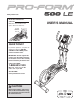 BEFORE YOU BEGIN Thank you for purchasing the PROFORM® 500 LE elliptical. The 500 LE elliptical provides an array of features designed to make your workouts at home more effective and enjoyable. manual. To help us assist you, note the product model number and serial number before contacting us. The model number and the location of the serial number decal are shown on the front cover of this manual. For your benefit, read this manual carefully before you use the elliptical.