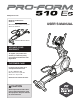 BEFORE YOU BEGIN Thank you for selecting the revolutionary PROFORM® 510 ES elliptical. The 510 ES elliptical provides an impressive selection of features designed to make your workouts at home more effective and enjoyable. manual. To help us assist you, note the product model number and serial number before contacting us. The model number and the location of the serial number decal are shown on the front cover of this manual. For your benefit, read this manual carefully before you use the elliptical.