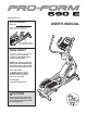 www.proform.com Model No. PFEL05809.3 Serial No. Write the serial number in the space above for reference. Serial Number Decal (on underside of frame) QUESTIONS? If you have questions, or if parts are damaged or missing, DO NOT CONTACT THE STORE; please contact Customer Care. IMPORTANT: Please register this product (see the limited warranty on the back cover of this manual) before contacting Customer Care. 1-888-533-1333 CALL TOLL-FREE: Mon.–Fri. 6 a.m.–6 p.m. MT Sat. 8 a.m.–4 p.m.
