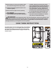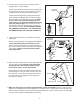 HOW TO LOWER THE TREADMILL FOR USE 1. Hold the upper end of the treadmill with your right hand. Pull the latch knob to the left and hold it. Pivot the frame down until the catch is past the latch pin. Catch Open Latch Knob Latch Pin 2. Hold the metal frame firmly with both hands, and lower the treadmill to the floor. CAUTION: To decrease the possibility of injury, do not lower the treadmill by gripping only the plastic foot rails. Do not drop the frame to the floor.