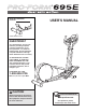 BEFORE YOU BEGIN Congratulations for selecting the revolutionary PROFORM¨ 695E elliptical crosstrainer. The PROFORM 695E is an incredibly smooth exerciser that moves your feet in a natural elliptical path, minimizing the impact on your knees and ankles. And the unique 695E features adjustable resistance and incline to help you get the most from your exercise. Welcome to a whole new world of natural, elliptical-motion exercise from PROFORM. Department toll-free at 1-800-999-3756, Monday through Friday, 6 a.
