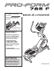 AVANT DE COMMENCER Merci dʼavoir choisi le nouvel appareil elliptique PROFORM® 785 F. Lʼappareil elliptique 785 F est équipé dʼun choix de fonctionnalités conçues pour rendre vos entraînements chez vous plus efficaces et plus agréables. permettre de mieux vous assister, notez le numéro du modèle et le numéro de série de lʼappareil avant de communiquer avec nous. Le numéro du modèle et lʼemplacement de lʼautocollant du numéro de série sont indiqués sur la page couverture avant de ce manuel.