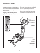 HOE DE ELLIPTISCHE TRAINER TE GEBRUIKEN HOE DE ELLIPTISCHE TRAINER TE VERPLAATSEN drie gaten in de pedaalveer te gebruiken. Zorg ervoor dat beide pedalen in dezelfde stand staan. Ga achter de elliptische trainer staan en houdt de Achterste Stabilisator (9) goed vast. Til de elliptische trainer zo hoog op dat deze met de hulp van de Wieltjes (22) kan worden verplaatst. Verplaats de elliptische trainer voorzichtig naar de gewenste plaats en zet het apparaat weer op de vloer neer.