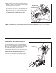 MAINTENANCE AND TROUBLESHOOTING HOW TO MOVE THE ELLIPTICAL EXERCISER Inspect and properly tighten all parts of the elliptical exerciser regularly. Replace any worn parts immediately. Stand in front of the elliptical exerciser, hold the handlebars firmly, and place one foot against one of the wheels. Pull the handlebars until the elliptical exerciser can be moved on the wheels, and carefully move the elliptical exerciser to the desired location.
