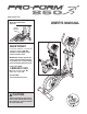 www.proform.com Model No. PFEL5105.0 Serial No. Serial Number Decal QUESTIONS? If you have questions, or if parts are damaged or missing, DO NOT CONTACT THE STORE; please contact Customer Care. IMPORTANT: Please register this product (see the limited warranty on the back cover of this manual) before contacting Customer Care. 1-888-533-1333 CALL TOLL-FREE: Mon.–Fri., 6 a.m.–6 p.m. MT Sat. 8 a.m.–4 p.m. MT ON THE WEB: www.proformservice.