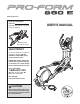 www.proform.com Model No. PFEL09009.2 Serial No. Write the serial number in the space above for reference. Serial Number Decal (under frame) QUESTIONS? If you have questions, or if parts are damaged or missing, DO NOT CONTACT THE STORE; please contact Customer Care. IMPORTANT: Please register this product (see the limited warranty on the back cover of this manual) before contacting Customer Care. 1-888-533-1333 CALL TOLL-FREE: Mon.–Fri., 6 a.m.–6 p.m. MT Sat. 8 a.m.–4 p.m. MT ON THE WEB: www.