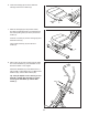 3. Attach the Frame Foot (11) to the underside of the Main Frame (1) with an M6 x 15mm Screw (28). 3 1 11 28 4. Insert the Sleeve (14) into the Front Stabilizer (4). 4 Next, orient the the Front Stabilizer (4) as shown, and insert the leg on the Main Frame (1) into the Front Stabilizer. Then, insert the Incline Pin (51) into the Front Stabilizer (4) and into one of the three adjustment holes in the leg on the Main Frame (1). Leg Adjustment Holes 1 14 51 4 5.