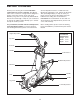 MOVING THE ELLIPTICAL TRAINER To move the elliptical trainer, first unplug the Transformer (not shown) from the 120-volt outlet and secure the elliptical trainer in the collapsed position (see EXTENDING THE SEAT BASE on page 12). Then, using the handle on the Upright Stabilizer (10), tilt the elliptical trainer onto the Stabilizer Wheels (47). Finally, move the elliptical trainer to the new location. 10 WARNING: The elliptical trainer is heavy; lift with your knees to prevent injury to your back.