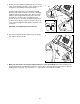 Locate the Reed Switch (24) and the Magnet (18) on the left side of the Pulley (114). Turn the Pulley until the Magnet is aligned with the Reed Switch. Make sure that the gap between the Magnet and the Reed Switch is about 1/8”. If necessary, loosen the Screw (25) and move the Reed Switch slightly. Retighten the Screw. Reattach the Hood, and run the treadmill for a few minutes to check for a correct speed reading. 1/8” 114 25 18 24 Top View PROBLEM: The walking belt slows when walked on SOLUTION: a.