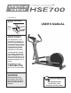 BEFORE YOU BEGIN Congratulations for selecting the PROFORM® HSE700 low-impact elliptical exerciser. The HSE700 is an incredibly smooth exerciser that moves your feet in a natural elliptical path, minimizing the impact on your knees and ankles. And the unique HSE700 features adjustable resistance, upper-body and stationary handlebars, and a multi-mode exercise monitor to help you get the most from your exercise. Welcome to a whole new world of natural, elliptical-motion exercise from PROFORM.