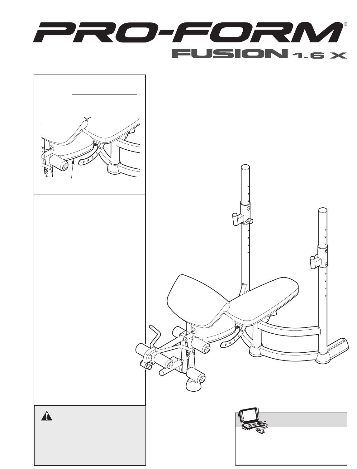 BEFORE YOU BEGIN manual. To help us assist you, please note the product model number and serial number before contacting us. The model number is PFBE1516.0. The serial number can be found on a decal attached to the weight bench (see the front cover of this manual). Thank you for selecting the versatile PROFORM® FUSION 1.6 X weight bench. The weight bench offers a selection of exercise stations designed to develop the major muscle group of the upper body.