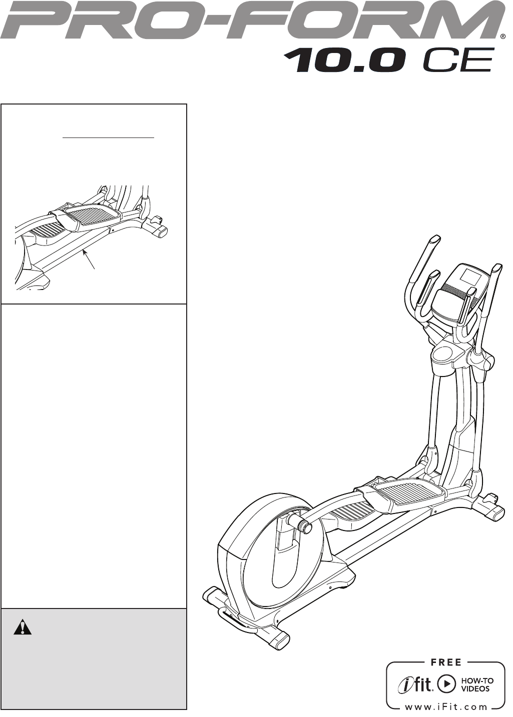 Meijer.com BEFORE YOU BEGIN Thank you for selecting the revolutionary PROFORM® 10.0 CE elliptical. The 10.0 CE elliptical provides an impressive selection of features designed to make your workouts at home more effective and enjoyable. manual. To help us assist you, note the product model number and serial number before contacting us. The model number and the location of the serial number decal are shown on the front cover of this manual.