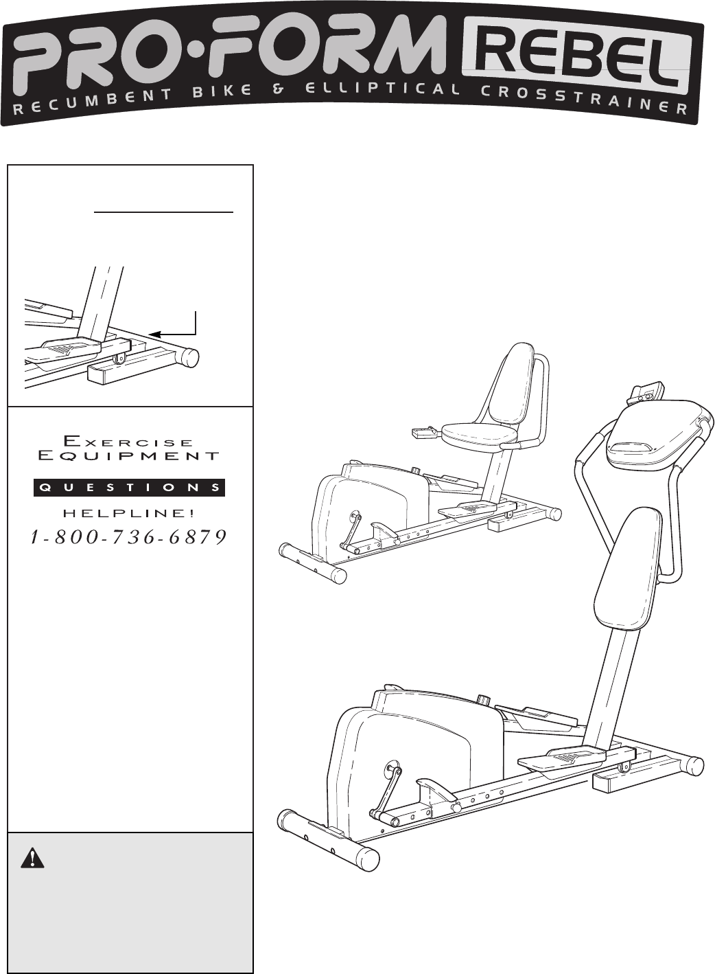 BEFORE YOU BEGIN Congratulations for selecting the revolutionary PROFORM¨ REBEL Recumbent Bike and Elliptical Crosstrainer. The REBEL is an incredibly smooth exerciser that moves your feet in a natural elliptical path, minimizing the impact on your knees and ankles. And the unique REBEL can easily be converted from an elliptical crosstrainer to a recumbent bike, giving you two machines in one. Welcome to a whole new world of natural, elliptical-motion exercise from PROFORM.