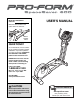 BEFORE YOU BEGIN Thank you for purchasing the revolutionary PROFORM® SPACESAVER 600 elliptical exerciser. The SPACESAVER 600 elliptical exerciser provides a wide array of features designed to make your workouts at home more effective and enjoyable—and when you’re not exercising, the unique elliptical exerciser can be folded out of the way. product model number and serial number before contacting us. The model number and the location of the serial number decal are shown on the front cover of this manual.